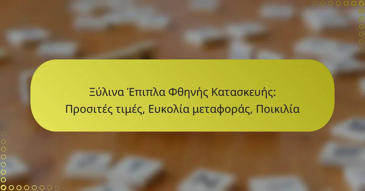 Τα ξύλινα έπιπλα φθηνής κατασκευής προσφέρουν μια οικονομική λύση για τον εξοπλισμό του σπιτιού, με τιμές που κυμαίνονται από 50 έως 300 ευρώ. Διαθέτουν ποικιλία σε σχέδια και τύπους, όπως καρέκλες, τραπέζια και έπιπλα αποθήκευσης, ικανοποιώντας τις ανάγκες κάθε καταναλωτή. Επιπλέον, η ευκολία μεταφοράς τους καθιστά ακόμα πιο ελκυστική επιλογή για όσους αναζητούν πρακτικότητα και προσιτές τιμές.